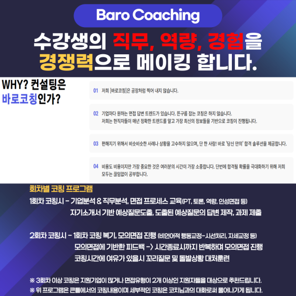 ※ 일반적으로 1차코칭은 이론위주의 코칭, 2차코칭 이후로는 모의면접과 같은 실습위주의 코칭으로 진행됩니다.