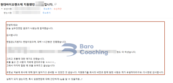 바로코칭에서 컨설팅 받은 학생의 현대바이오랜드 면접 합격 후기입니다.