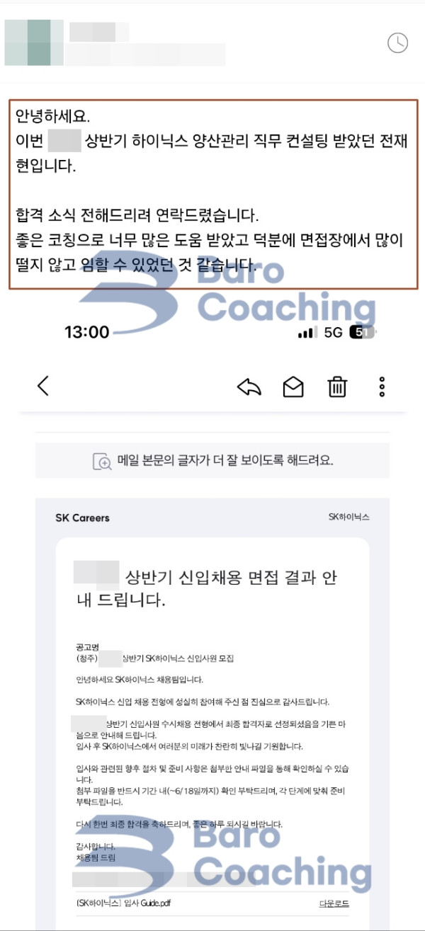 바로코칭에서 컨설팅 받은 학생의 SK하이닉스 면접 합격 후기입니다.