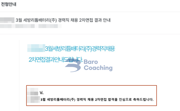 바로코칭에서 컨설팅 받은 학생의 세방리튬배터리 면접 합격 후기입니다.