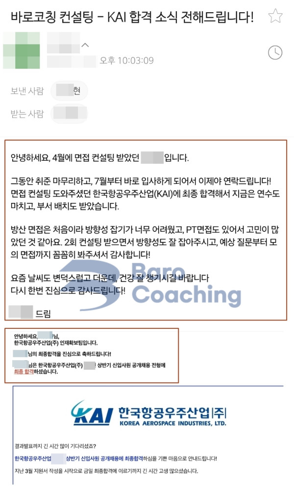 바로코칭에서 컨설팅 받은 학생의 한국항공우주산업(KAI) 면접 합격 후기입니다.