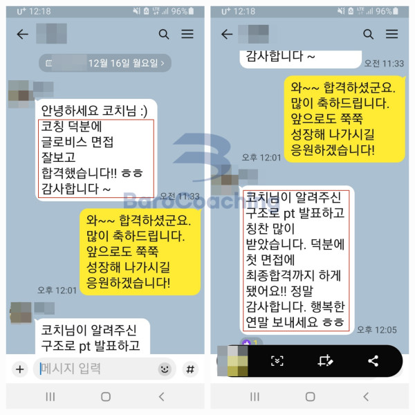 바로코칭을 통해 합격한 수강생들의 실제 문자/카톡 후기를 모았습니다.