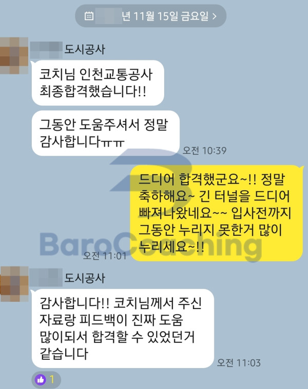 바로코칭에서 컨설팅 받은 학생의 인천교통공사 면접 합격 후기입니다.