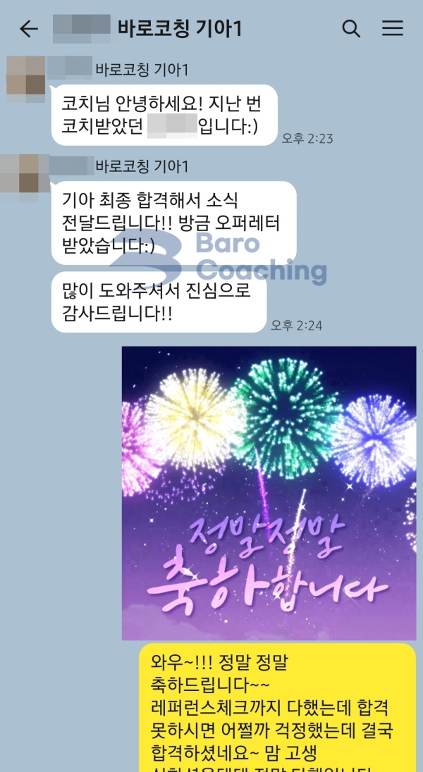 바로코칭을 통해 합격한 수강생들의 실제 문자/카톡 후기를 모았습니다.