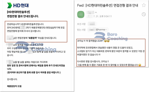 바로코칭에서 컨설팅 받은 학생의 HD현대마린솔루션 면접 합격 후기입니다.