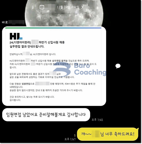 바로코칭에서 컨설팅 받은 학생의 HL디앤아이한라 면접 합격 후기입니다.