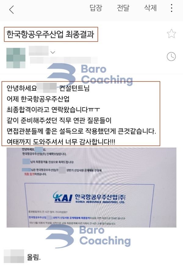 바로코칭에서 컨설팅 받은 학생의 한국항공우주산업(KAI) 면접 합격 후기입니다.